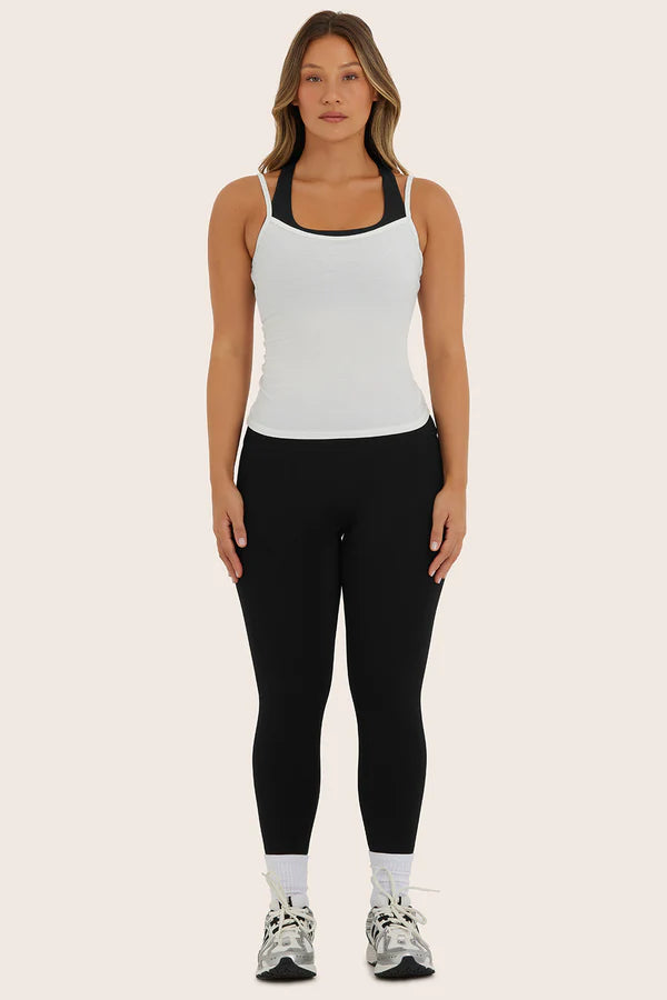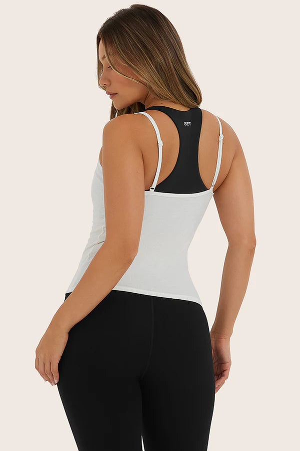 - Attached full-length ribbed cami with wide scoop front neckline.